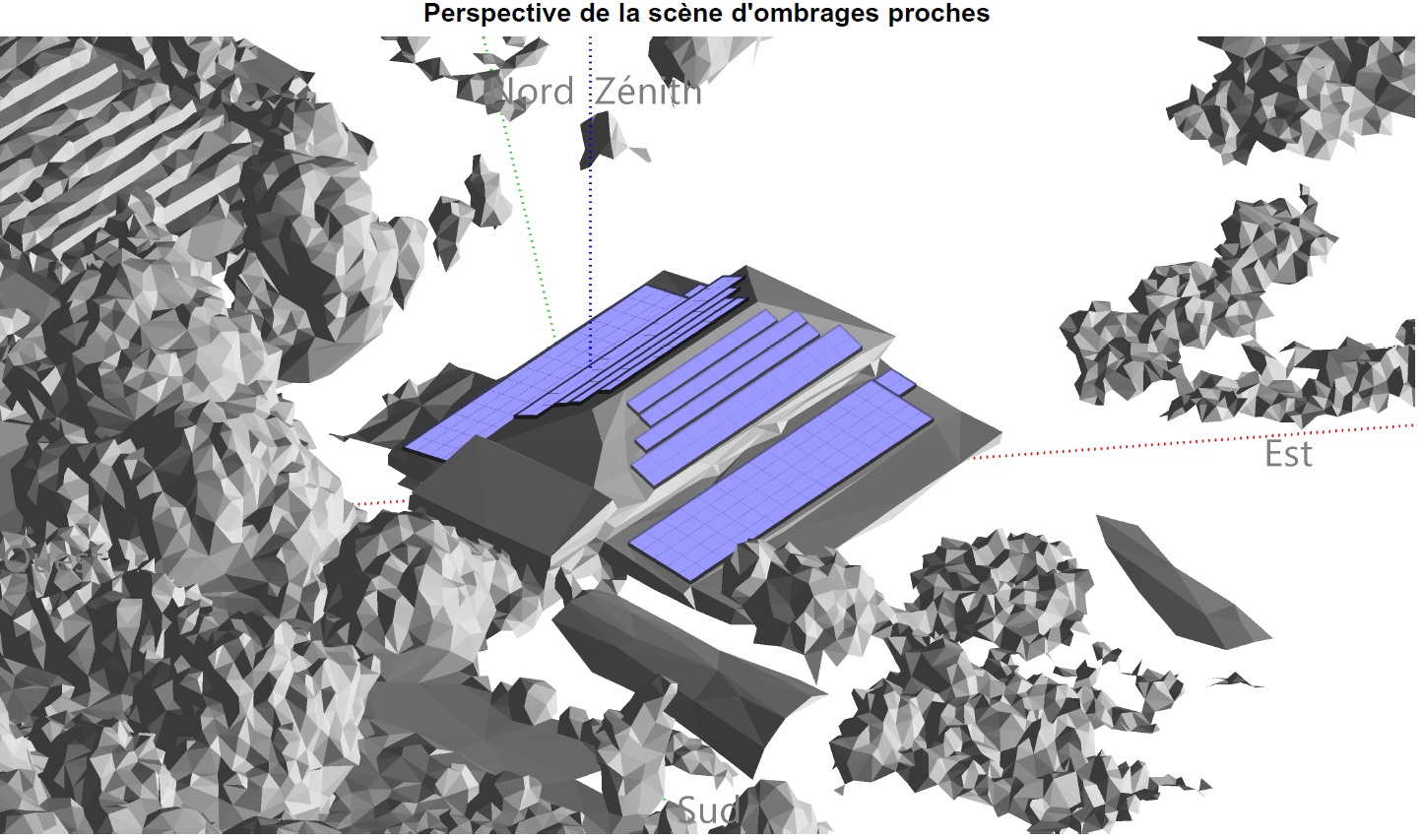 Prestation réalisée par Phoenix Energie : Phoenix Energie réalise les simulations de production, sous le logiciel PV-SYST, afin de quantifier le productible réel normal et évaluer les pertes de production dûes aux différents ombrages. L'environnement proche a été numérisé au format .3ds via une caméra-drone et intégré dans le calcul PV-SYST. Prestation terminée en 2026 |